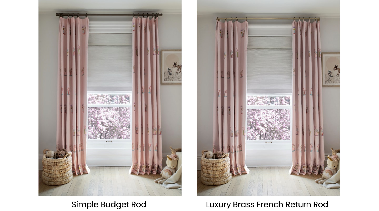 Luxury custom rods are perfect in key areas like the living room, primary bedroom, or dining room. Use simpler styles in utility spaces but avoid cutting corners on drapery weight support.