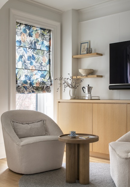 Elevate your space with Pleated Roman Shades. Featuring hand-stitched pleats, our Pleated Roman Shades look elegant in any window. Offers light filtering and privacy, and draft and noise insulation with the right lining. Combine this timeless style with our blue floral fabric for a bold, classic look. Easy for daily use whether you choose chain loop or motorized.